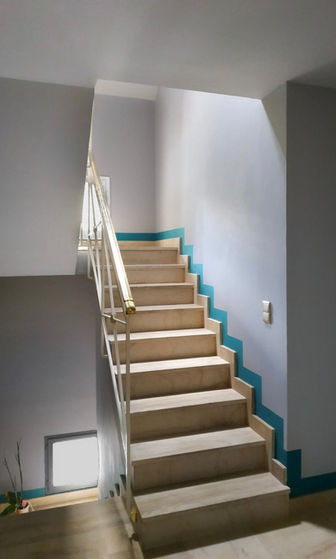 Dans cette villa familiale à deux étages, l’entrée et les couloirs ont été sublimés par une mise en peinture soignée pour créer un parcours visuel fluide et accueillant.